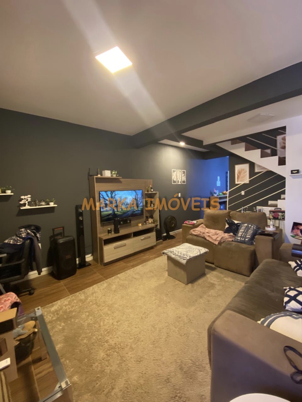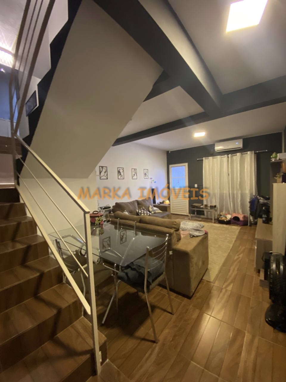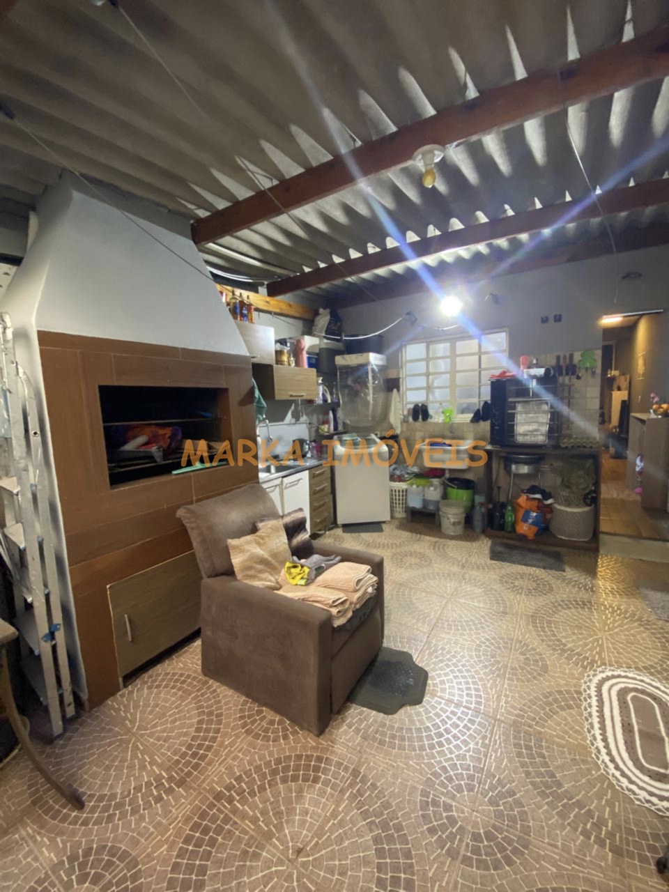 Térreo - Sala de estar/jantar, cozinha, escadaria e garagem coberta para 1 carro; Fundos com churrasqueira;